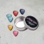 Box in metallo con 5 plettri colorati, diametro 5cm